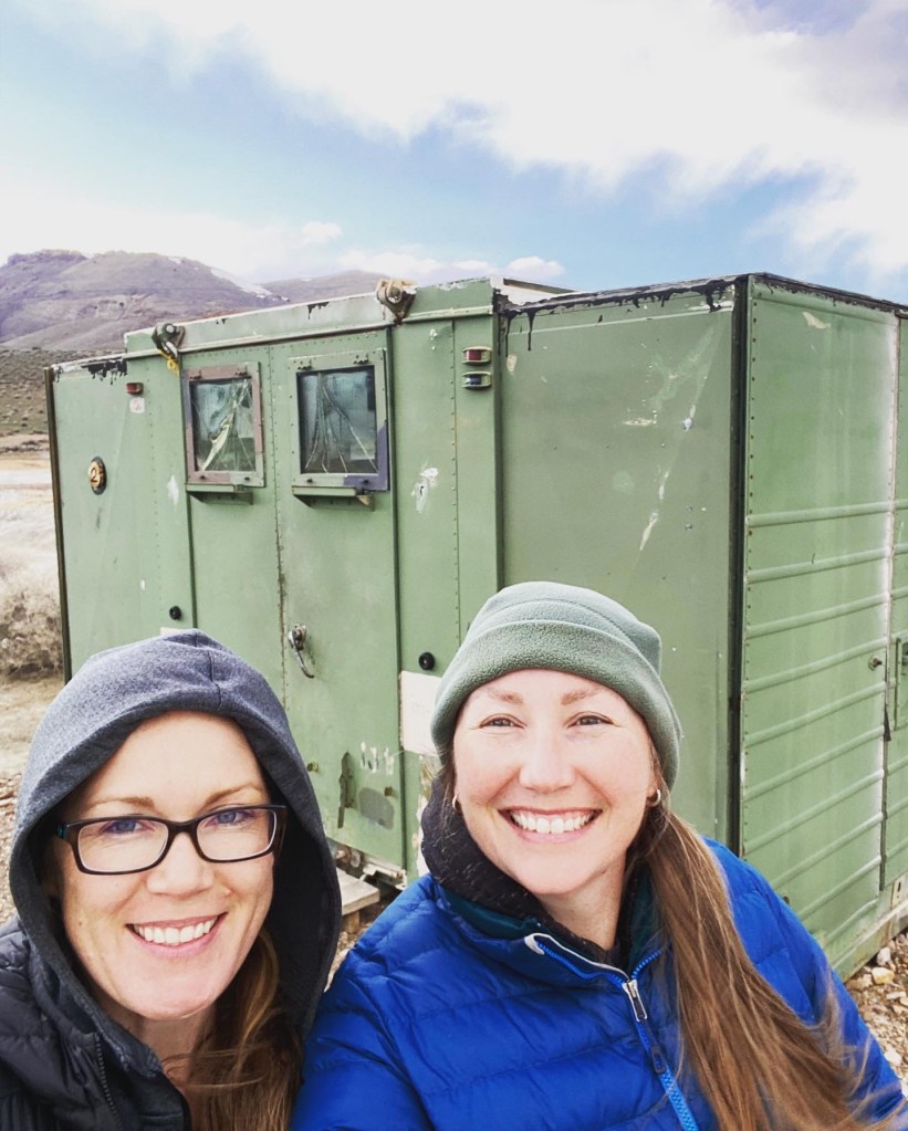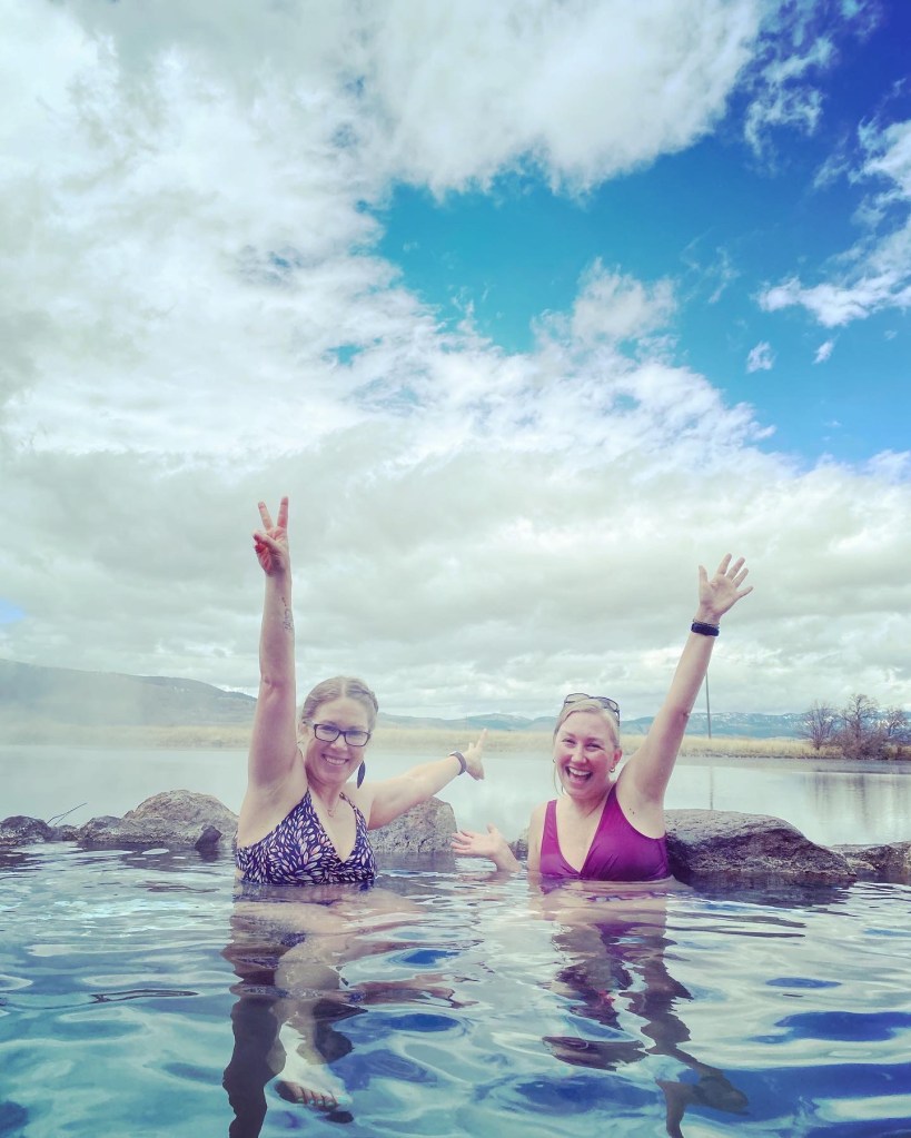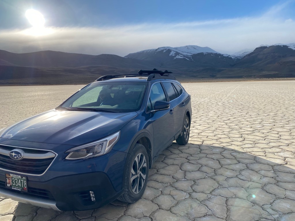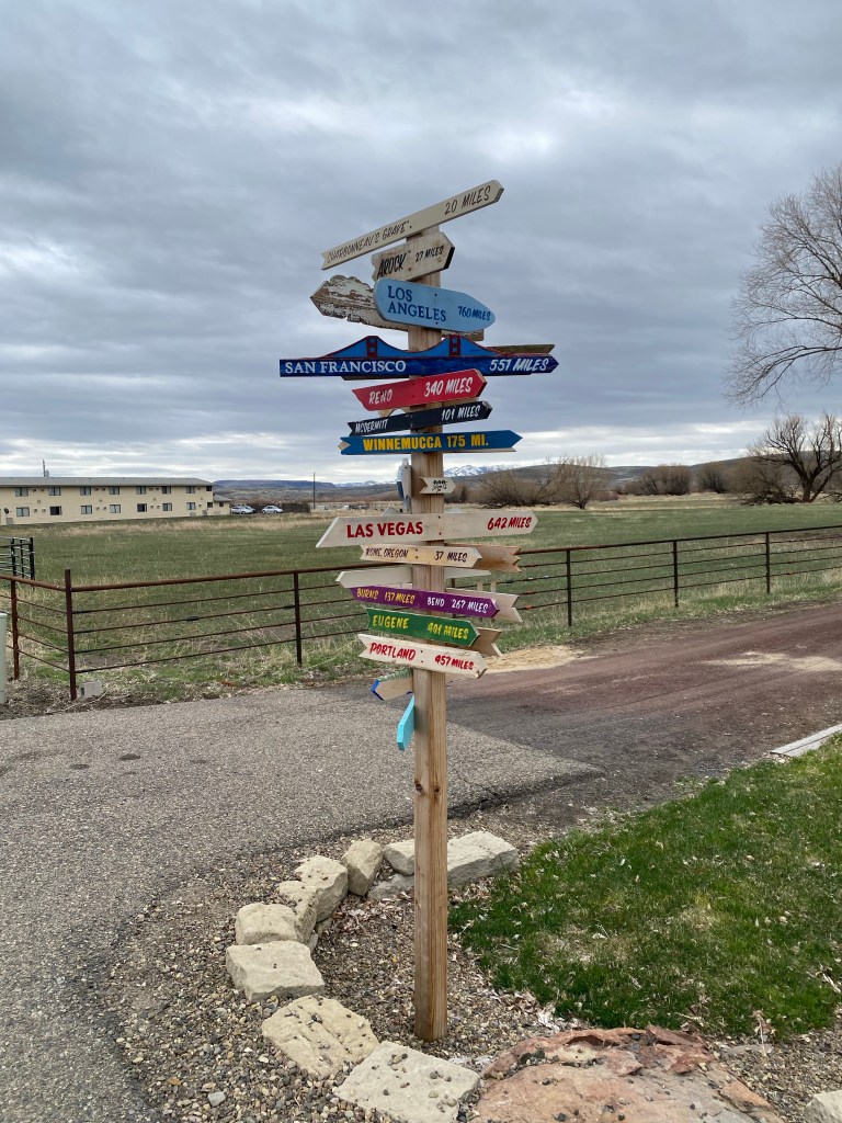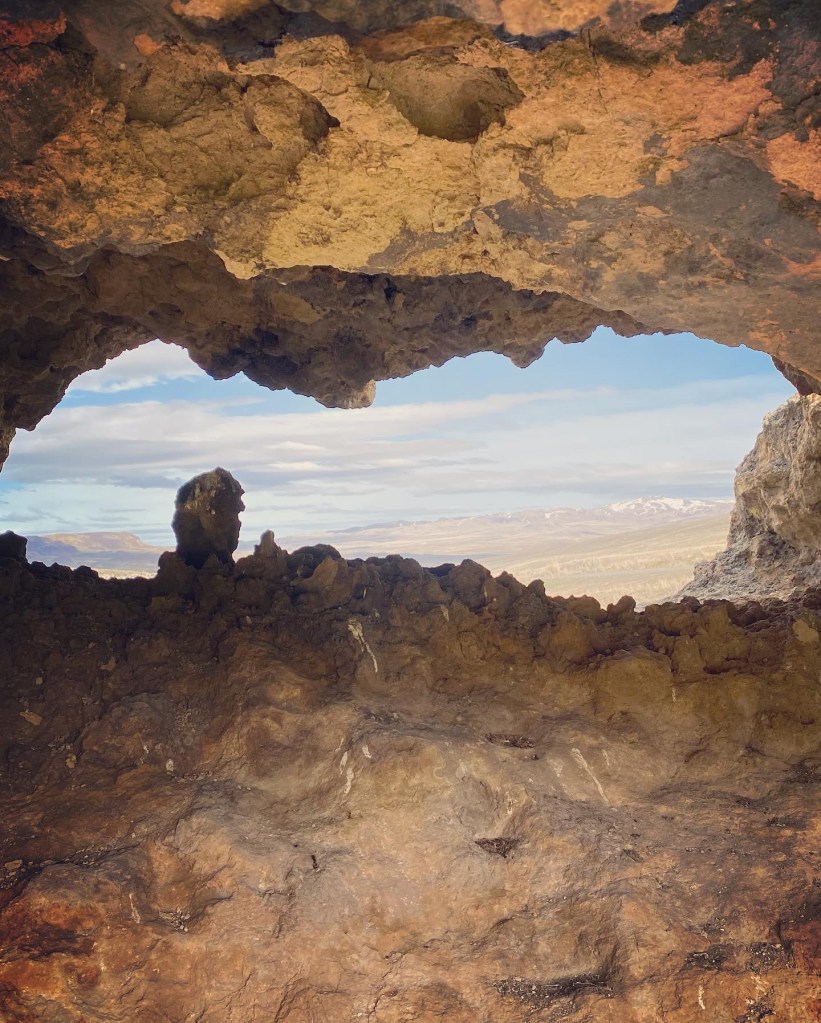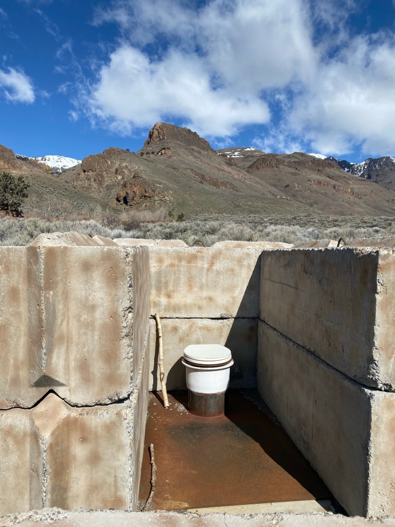 Finally… after skirting the Steens Mountains and driving through some more snow flurries, we made it to the Alvord Desert Hot Springs! This place is exactly as they describe online – rustic and interesting, and they give a great Veteran’s discount. You can camp here, but this time we opted to rented a “bunker” for the evening, and promptly checked out the hot springs. They have two pools (one was super hot and one was lukewarm). Note that clothing is optional here unless children are present 🤣 – we also drove out on the dry lakebed (!) which was way cooler than I expected! The stargazing here is INCREDIBLE!!! We woke up at 2am to see the stars and were rewarded with 3 shooting stars and a serenade from the local coyotes. The staff here are super friendly and they have a limited supply of gifts, steaks to cook on the grills, snacks and drinks. If you stay here, you also get access to drive up to Pike Creek Trail which has a year round running stream and a pretty incredible pit toilet with a view.